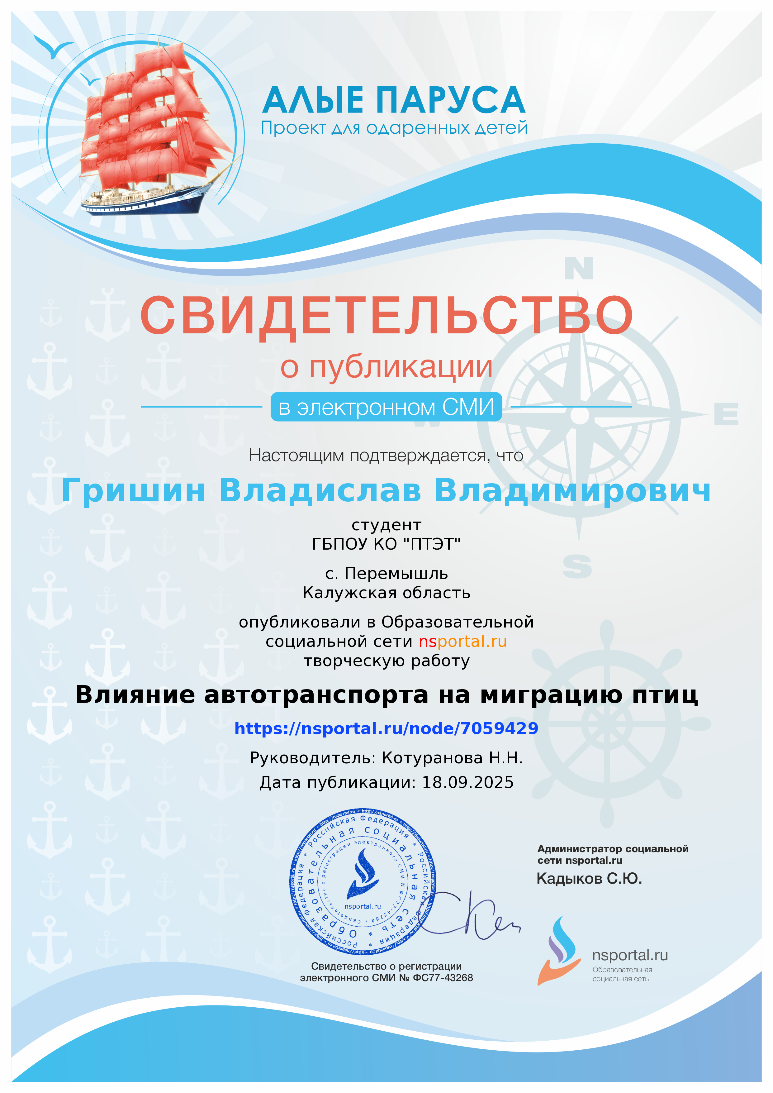 Участие студента в проекте для одаренных детей "Алые паруса" с проектом по биологии.